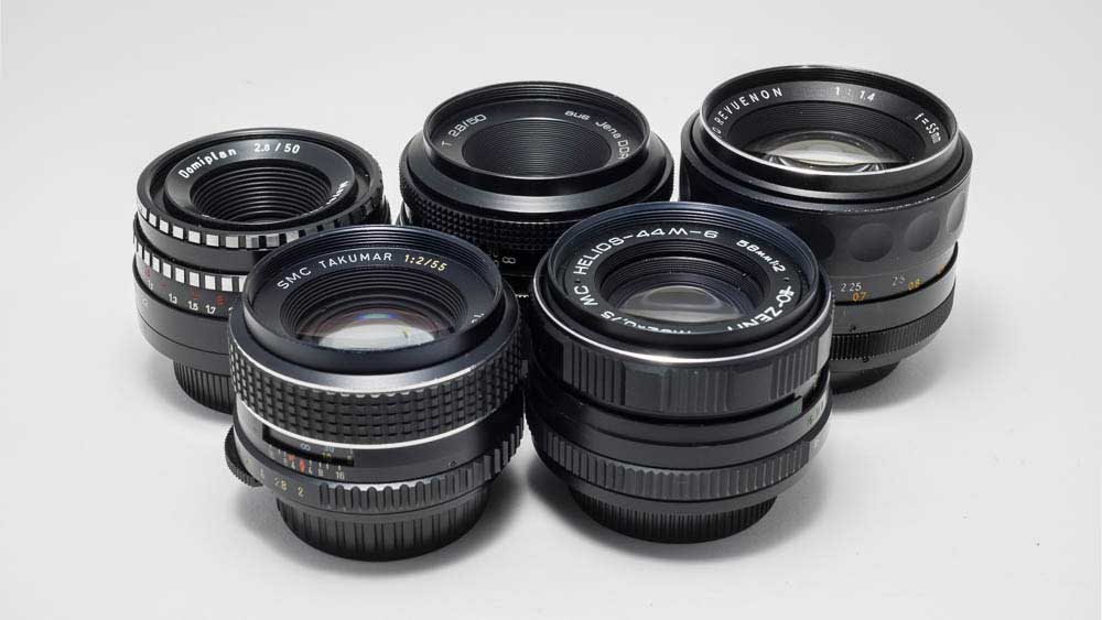 Von den Standardobjektiven der 60er und 70er Jahre des vergangenen Jahrhunderts bieten sich Domiplan 50/2.8, Tessar 50/2.8, Helios-44 58/2, Takumar 55/2 und Auto Revuenon 55/1.4 an. Ihre optischen Konstruktionen spiegeln die technischen Möglichkeiten der Vergangenheit wie auf einem Zeitstrahl. Als typischer Triplet-Vertreter und Trioplan-Nachfolger hat das Domiplan drei Linsen in drei Gruppen, in Kurzform 3/3, und repräsentiert eine der ältesten klassischen Objektiv-Konstruktionen. Das Tessar bietet bereits ein 4/3-Design – zu seiner Zeit eine technische Revolution. Helios-44 und Takumar machten das 6/4- beziehungsweise 6/5-Design populär. Zum Innenleben des Auto Revuenon gibt es keine verlässlichen Informationen, doch die einstige Marktmarkt von Foto Quelle dürfte dieses lichtstarke Objektiv (f/1.4) für viele Fotoamateure erschwinglich gemacht haben. Alle Objektive kosten zusammen mit etwas Glück und Geduld circa 200 Euro und benötigen nur einen einzigen M42-Adapter.