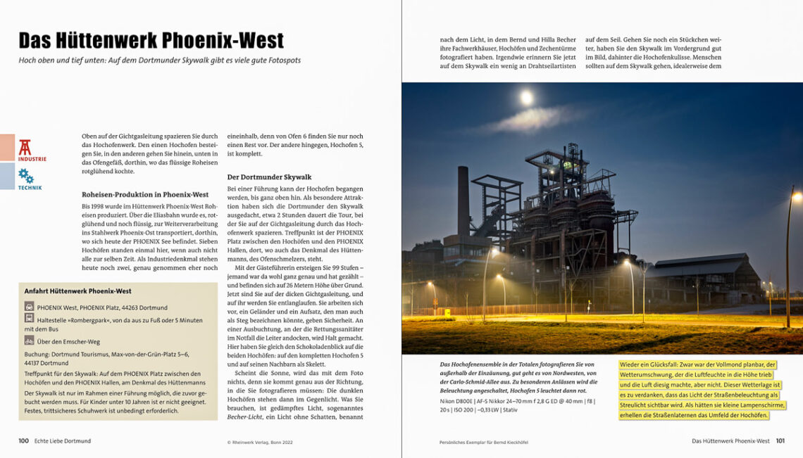 Phoenix West gehört nicht zur Route der Industriekultur, ist aber ebenso spektakulär und nur wenige Autominuten von der Kokerei Hansa entfernt. Das Areal gehört dem niederländischen Stadtentwickler Walas B.V. und der Hochofen ist nur über geführte Touren zugänglich. Aktuell werden fünf Touren zu unterschiedlichen Tageszeiten angeboten und ermöglichen spektakuläre Ausblicke – sofern das Wetter mitspielt. Ansonsten ist das Gelände von öffentlichen Wegen umgeben und bietet Fotografierenden zahlreiche Perspektiven rund um die Uhr.