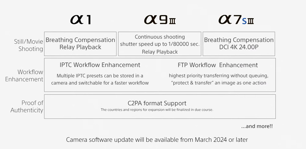 Anlässlich der Präsentation der Alpha 9 III hat Sony ein Firmware-Update für die neue Kamera sowie die älteren Modelle Alpha 1 und Alpha 7S III in Aussicht gestellt. Die Updates sind für März 2024 oder später geplant. Bei allen drei Kameras soll die Unterstützung für das C2PA-Format der Content Authenticity Initiative hinzugefügt werden. Damit soll sichergestellt werden können, dass die Herkunft der mit den Kameras fotografierten Bildern nachverfolgbar ist. Des weiteren sollen alle drei Kameras mit der Option ausgestattet werden, verschiedene IPTC-Presets zu speichern. Auch der FTP-Workflow soll verbessert werden.