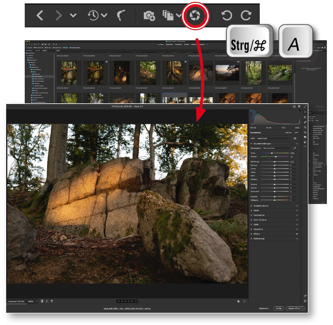 Über das Blendensymbol öffnen Sie Fotos in Camera Raw, ohne dass Photoshop dafür geöffnet oder aktiv werden muss. Das Tastenkürzel »Strg/Cmd-R« erfüllt die gleiche Funktion. Sie ermöglicht es beispielsweise, aus Bridge heraus Änderungen mit Hilfe von Camera Raw auf eine große Zahl von Bildern anzuwenden oder sie in andere Formate wie etwa DNG zu konvertieren. Daher können Sie diese Aktion auch im Hintergrund ablaufen lassen und in Photoshop weiter an anderen Dingen arbeiten. Ein weiterer Vorteil ist, dass Sie so Bilder in den Formaten JPEG, TIFF oder HEIC auf einfache Art und Weise in Camera Raw öffnen und optimieren können. Dafür müssten Sie ansonsten die Camera-Raw-Voreinstellungen unter »JPEG-, HEIC- und TIFF-Handhabung« anpassen oder im Öffnen-Dialog umständlich das Format auf »Camera Raw« ändern.