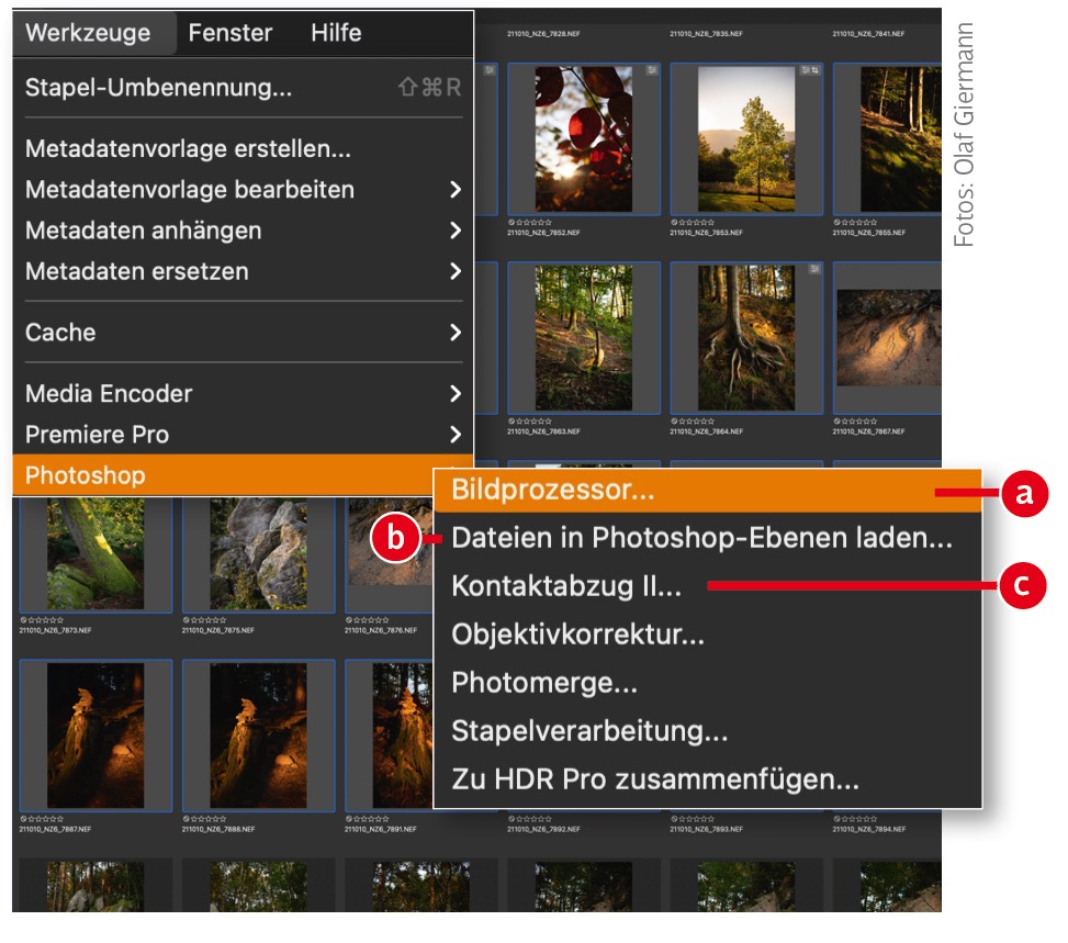 Aus Bridge heraus können Sie Dateien an die verschiedenen Creative-Cloud-Programme senden. Skripte im Menü »Werkzeuge« bieten dabei erweiterte Funktionen. So wandeln Sie mit dem »Bildprozessor« (a) Bilder in andere Formate um und wenden bei Bedarf gleichzeitig eine Aktion an. Ausgewählte Dateien lassen sich als Stapel von Photoshop-Ebenen laden (b); dabei erhalten die Ebenen automatisch den Dateinamen. Über den »Kontaktabzug« (c) erzeugen Sie eine Bildübersicht mit kleinen Vorschauen, die Sie sich zum Beispiel als Merkhilfe für Festplatteninhalte ausdrucken oder als PDF speichern können. Andere aufgeführte Befehle sind vor allem durch aktuelle Camera-Raw-Workflows mehr oder weniger veraltet: Objektiv- und Stapelkorrekturen sowie Panorama- und HDR-Erzeugung sind in Camera Raw einfacher und qualitativ besser durchzuführen.