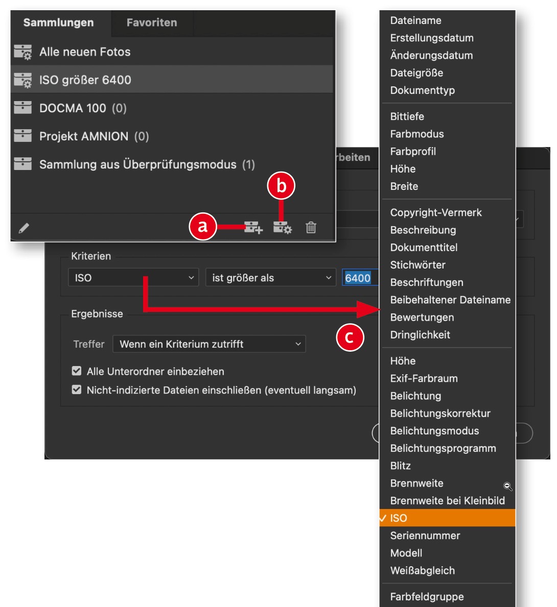 Das Fenster »Sammlungen« erspart Ihnen dabei entstehende Redundanzen und den dadurch resultierenden hohen Speicherbedarf. Erzeugen Sie für das jeweilige Projekt eine Sammlung (a) und fügen Sie dieser die benötigten Dateien per Drag-and-Drop hinzu. Mit »Smartsammlungen« (b) speichern Sie Suchabfragen, die den Dateinamen, Exif- und Metadaten, Farb- und Sterne-Markierung sowie Stichwörter beinhalten können. All diese Kriterien (c) lassen sich beliebig komplex ein- und ausschließen und gelten für einzelne Verzeichnisse oder auch gesamte Festplatten.