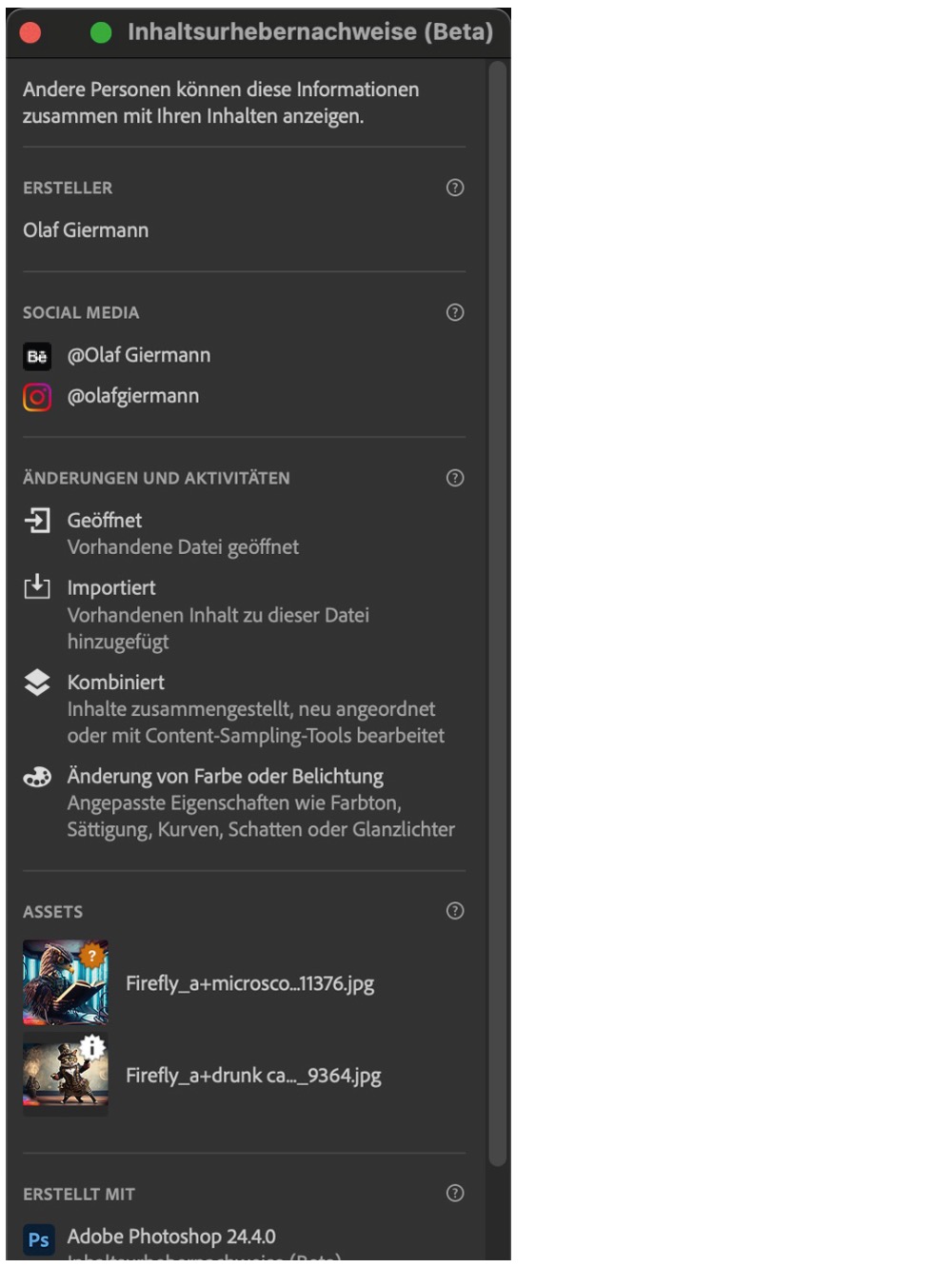 Adobe Firefly versieht Bilder automa­tisch mit Inhaltsurhebernachweisen. Auch wenn Firefly bis zum Fotorealis­mus noch ein wenig Zeit brauchen dürfte, wird der Missbrauch von KI-generierten Bildern erschwert. Denn über die Verify-Seite lässt sich die Beteiligung der KI nachweisen. Das gezeigte Fenster öffnen Sie mit dem »Vorschau«-Knopf im Fenster »Inhaltsurhebernachweise«.