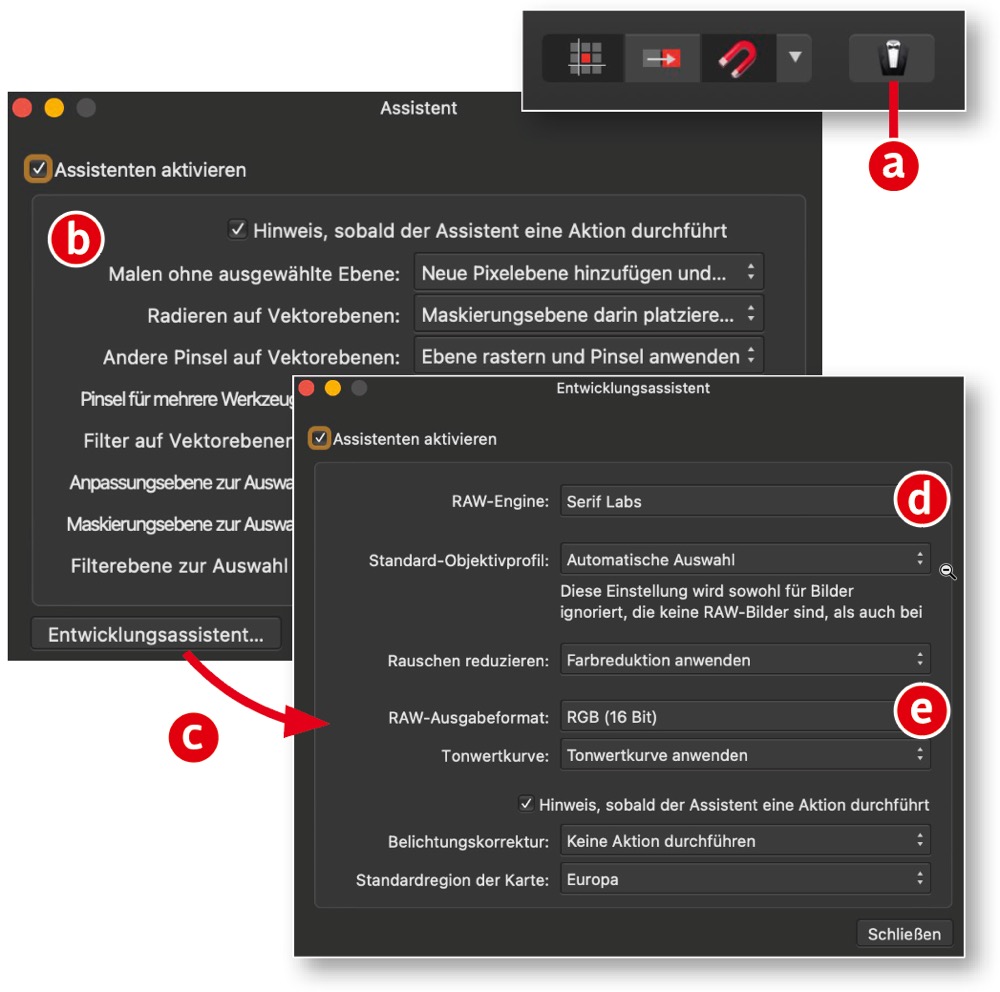 Assistenten helfen dabei, das Standardverhalten von Affinity Photo festzulegen. Über »Ansicht > ­Assistenteneinstellungen« oder über das Icon in der Symbolleiste (a) legen Sie fest, wie Affinity Photo bei bestimmten Aktionen reagiert (b). Mit der Schaltfläche »Entwicklungsassistent« (c) gelangen Sie in einen weiteren Dialog, in dem Sie die Raw-Entwicklungsstandards einstellen. Hier können Sie beispielsweise auch die »Raw-Engine« wechseln und statt der Engine von Serif auf die (teils bessere) von Apple umstellen (d) und wählen, in welcher Bittiefe von der Raw- an die Photo-Persona übergeben werden soll (e).