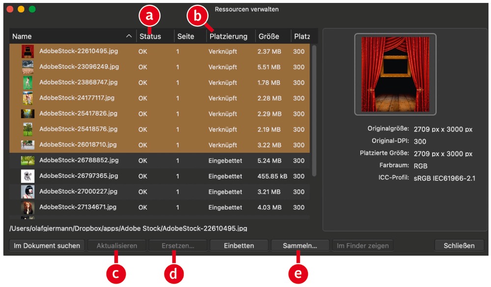 Verlinkte Datein sind das Äquivalent zu Photoshops verknüpft platzierten Smartobjekten. In Affinity Photo platzieren Sie Ihre Dateien als Verknüpfung, indem Sie »Datei > Regel zur Platzierung > Verknüpft« wählen und danach Dateien per Drag & Drop einfügen. Auf diese Weise lässt sich beispielsweise ein und dieselbe Datei in verschiedenen Projekten verwenden. Ändern Sie die Ursprungsdateien, brauchen Sie die entsprechende Ebene in der jeweiligen Projektdatei nur zu aktualisieren. Unter »Ansicht > Ressourcen verwalten« finden Sie einen dafür hilfreichen Dialog, in dem alle platzierten Dateien aufgelistet sind. Auf einen Blick sehen Sie hier den Status der Dateien (a) und die Art der Platzierung – verknüpft oder eingebettet (b). Ist …