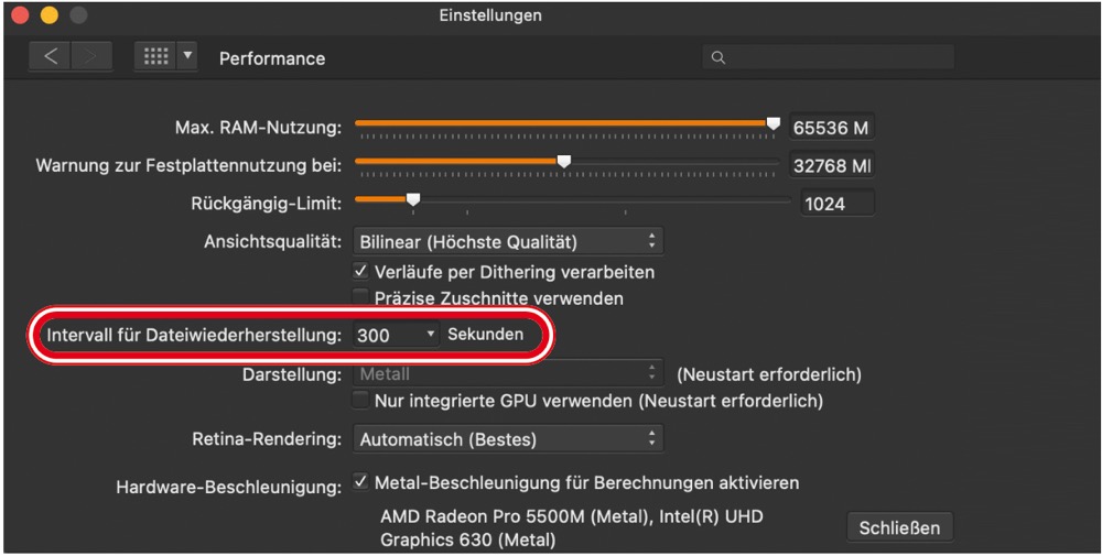 Affinity Photo kann automatisch in bestimmten Zeitabständen Wiederherstellungsdateien speichern. Das Intervall dieser Speichervorgänge legen Sie in den »Voreinstellungen« unter »Performance: Intervall für Dateiwiederherstellung« fest. Möglich ist das Einstellen einer Zeitspanne von 30 bis 2700 Sekunden. Nach Ablauf des gewählten Intervalls speichert Affinity Photo für geöffnete Dokumente eine temporäre Datei. Durch diese Speicherung lassen sich nach einem Programmabsturz Dokumente beim nächsten Neustart wiederherstellen. Verwechseln Sie diese aber nicht mit dem eigentlichen Speichern Ihrer Dokumente an dem von Ihnen festgelegten Speicherort. Das nimmt Ihnen Affinity Photo nicht ab.
