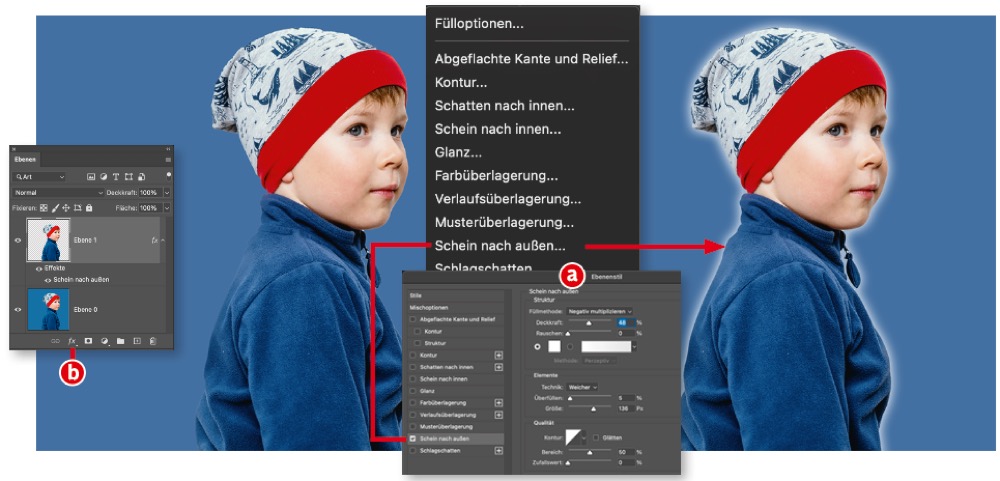 Jeder Ebene, außer der Hintergrundebene, können Sie Effekte zuweisen. Abgesehen von einem »Schlagschatten«, einer »Farbüberlagerung« oder – wie hier – einem »Schein nach außen« richten sich diese Effekte weniger an Fotografen, sondern eher an grafisch orientierte Gestalter. Meist nutzen diese Anwender solche Features für Schrifteffekte, um Layout-Objekte mit Schatten und Reliefs plastischer erscheinen zu lassen, oder für andere grafische Arbeiten. Den »Ebenenstil«-Dialog (a) öffnen Sie durch Doppelklick auf einen Ebenen-Eintrag in der Ebenenpalette oder per Klick auf das »fx«-Symbol (b). Alternativ finden Sie einen Eintrag »Ebenenstil« auch im Menü »Ebene«. Die Möglichkeiten sind extrem komplex und ich rate Ihnen, sich zunächst eine Ebene mit einem …