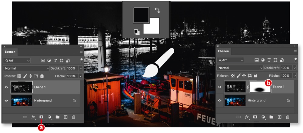 Die Ebenenmaske ist ein Graustufenbild, das die Transparenz der Ebene steuert: Wo die Maske weiß ist, erscheint die Ebene opak, wo sie schwarz ist, bleibt sie vollkommen durchsichtig und bei Grautönen um so durchsichtiger, je heller das Grau ist. Klicken Sie am unteren Rand der Ebenenpalette auf das Ebenenmasken-Symbol (a), erscheint neben der Ebenen-Miniatur ein weißes Feld (b). Wenn Sie es aktivieren und dort mit schwarzer Farbe und dem Pinsel malen, werden die geschwärzten Bereiche ausgeblendet. Klicken Sie zuvor mit gehaltener Alt-Taste auf das Ebenenmasken-Symbol, erscheint als Ausgangspunkt ein schwarzes Feld neben der Ebenen-Miniatur und der Ebeneninhalt wird zugleich komplett ausgeblendet. Malen Sie auf der …