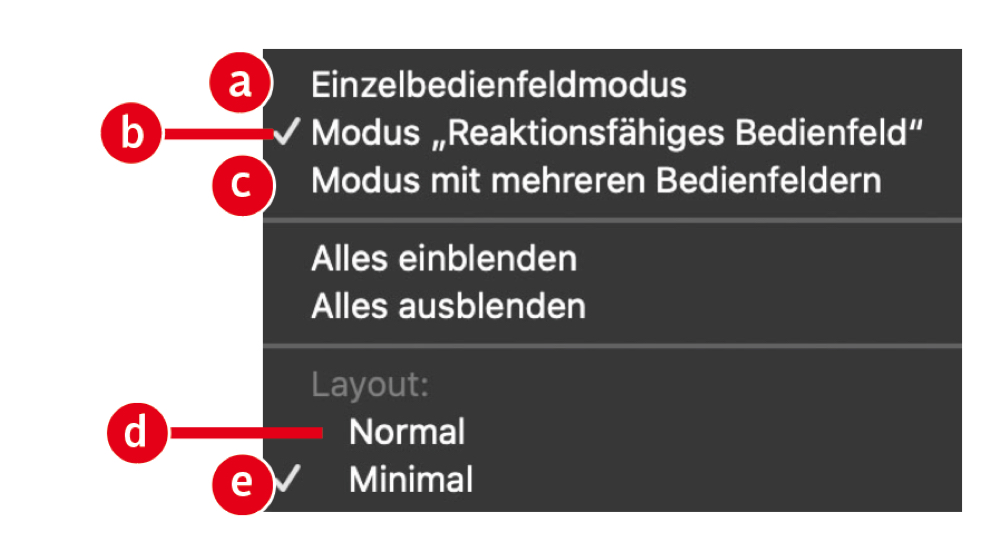 - Der »Modus mit mehreren Bedienfeldern« (c) erlaubt das manuelle Öffnen und Schließen von Bedienfeldern. Falls Sie ein Freund des Scrollens per Mausrad oder Scrollbalken sind, ist das der Modus der Wahl.
