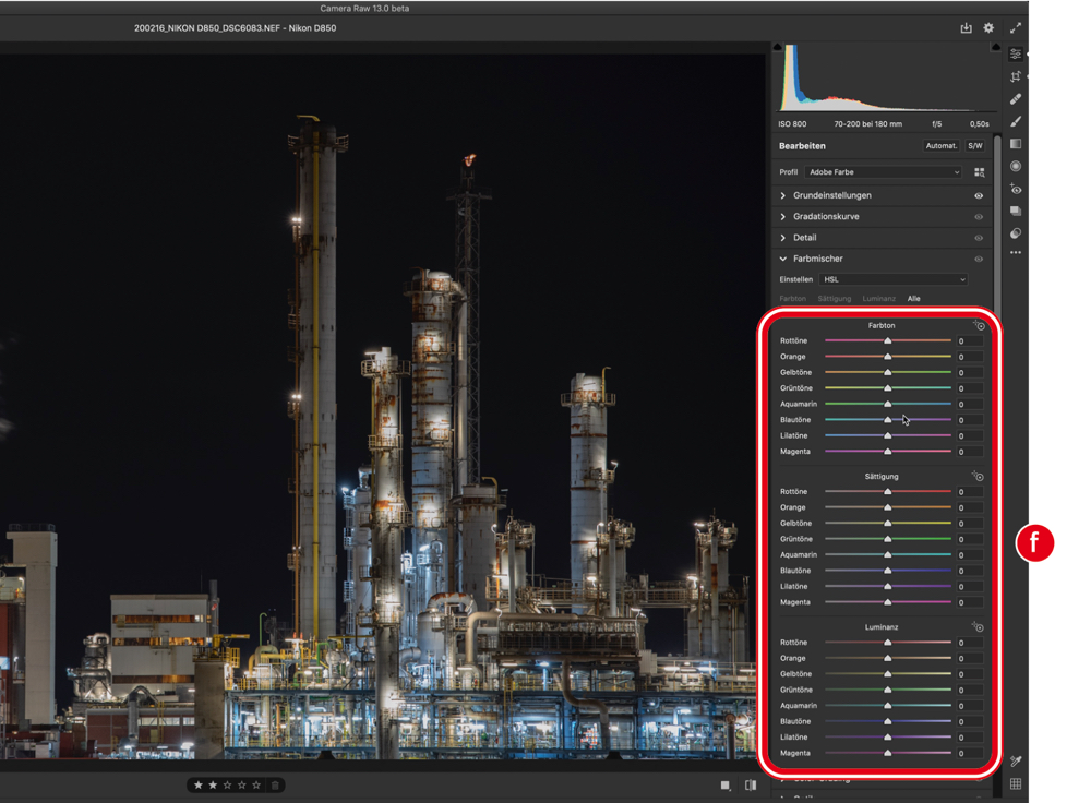 Deutlich sichtbar ist aber der Unterschied zwischen dem vorherigen Standard-Layout »Normal« (d) und dem neuen Kompakt-Modus namens »Minimal« (e), den Sie per Rechtsklick auf eine der Camera Raw-Kopfzeilen wählen können.