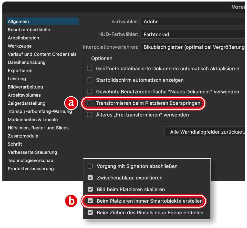 Wenn Sie ein Bild vom Finder/Explorer in ein anderes Bild ziehen, spricht man von Platzieren. Standardmäßig wird dabei ein Smartobjekt erzeugt (b) und automatisch der Transformationsrahmen aktiviert (a), so dass Sie schnell die Bildgröße anpassen können. Falls Sie dieses Verhalten stört, können Sie es in den Voreinstellungen unter »Allgemein« umstellen. Bilder werden dann in Ihrer Originalauflösung als Pixelebene platziert.