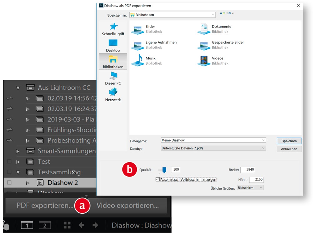 Nicht immer ist es möglich, eine Diashow direkt aus Lightroom Classic abzuspielen, wenn beispielsweise die Fotos auf einer Veranstaltung gezeigt werden sollen. Alternativ kann auch ein Video oder die einzelnen Folien als JPEG-Dateien exportiert werden. Die maximale Flexibilität bietet aber der PDF-Export (a) direkt aus dem »Diashow«-Modul. Im Dialogfenster können zudem weitere Qualitätsstufen (b) definiert werden. Mit einem Doppelklick auf die PDF-Datei wird sofort der Präsentationsmodus gestartet. Erfahrene Benutzer haben in Acrobat DC oder einem anderen PDF-Editor die Möglichkeit, Folien neu zu arrangieren, Überblendungen anzupassen oder zu entfernen sowie weitere multimediale Inhalte zu ergänzen.