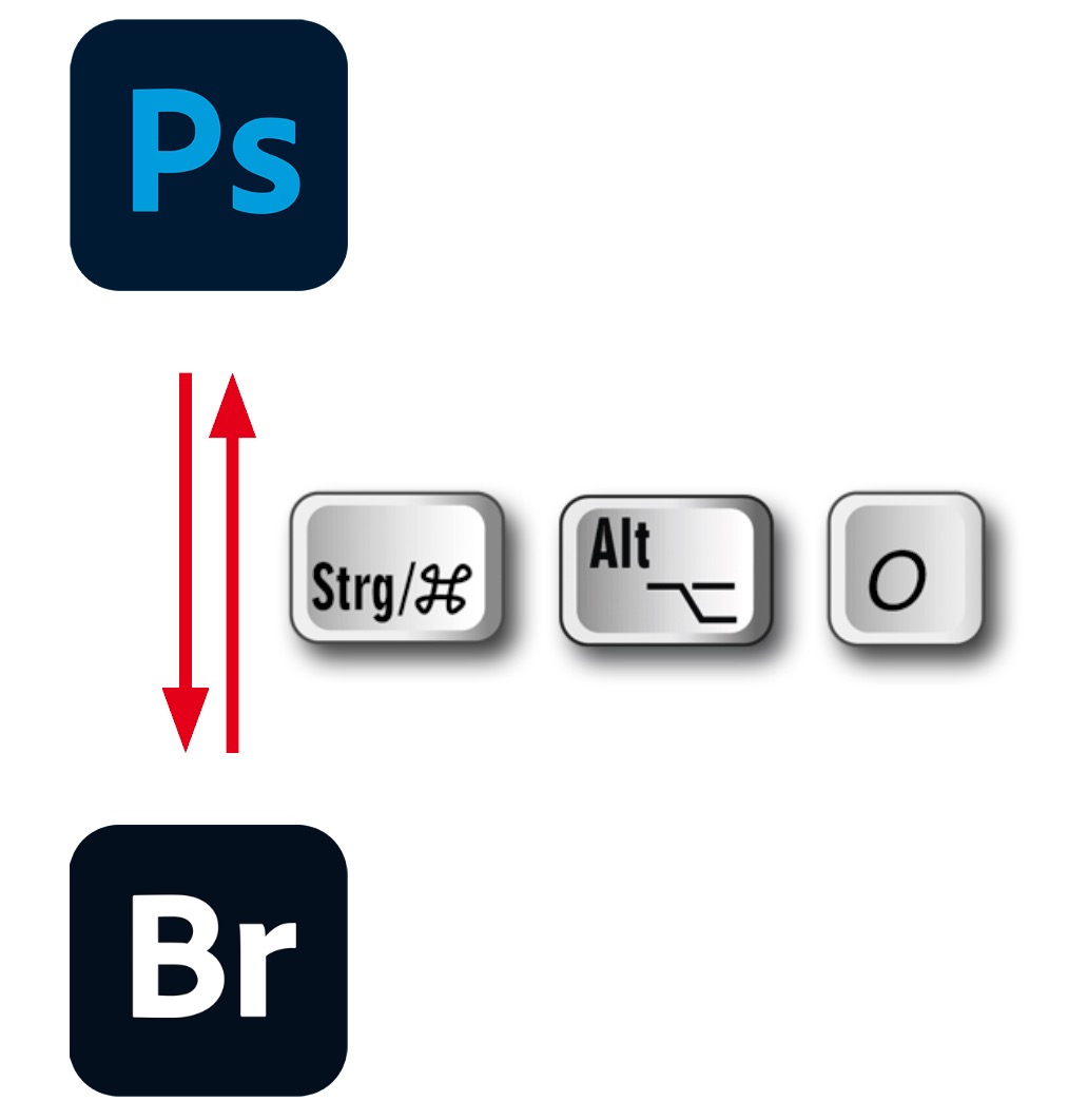 Zwischen Bridge und Photoshop wechseln Sie in Nullkommanichts hin und her. Sie kennen und nutzen vielleicht schon die Möglichkeit, per Tastatur zwischen verschiedenen Programmen zu wechseln. Der Shortcut dafür ist in der Regel »Strg/Cmd-Tab«. Damit können Sie auch zwischen Photoshop und Bridge hin- und herschalten. Sobald Sie aber zwischenzeitlich auch andere Programme benutzt haben, müssen Sie dieses Kürzel oft mehrfach drücken, um zur jeweils anderen Adobe-App zu gelangen. Effizienter geht das mit der Tastenkombination »Strg/Cmd-Alt-O« (O wie Olaf, nicht Null), die Sie in Photoshop und Bridge nutzen, um zum jeweils anderen Programm zu springen.