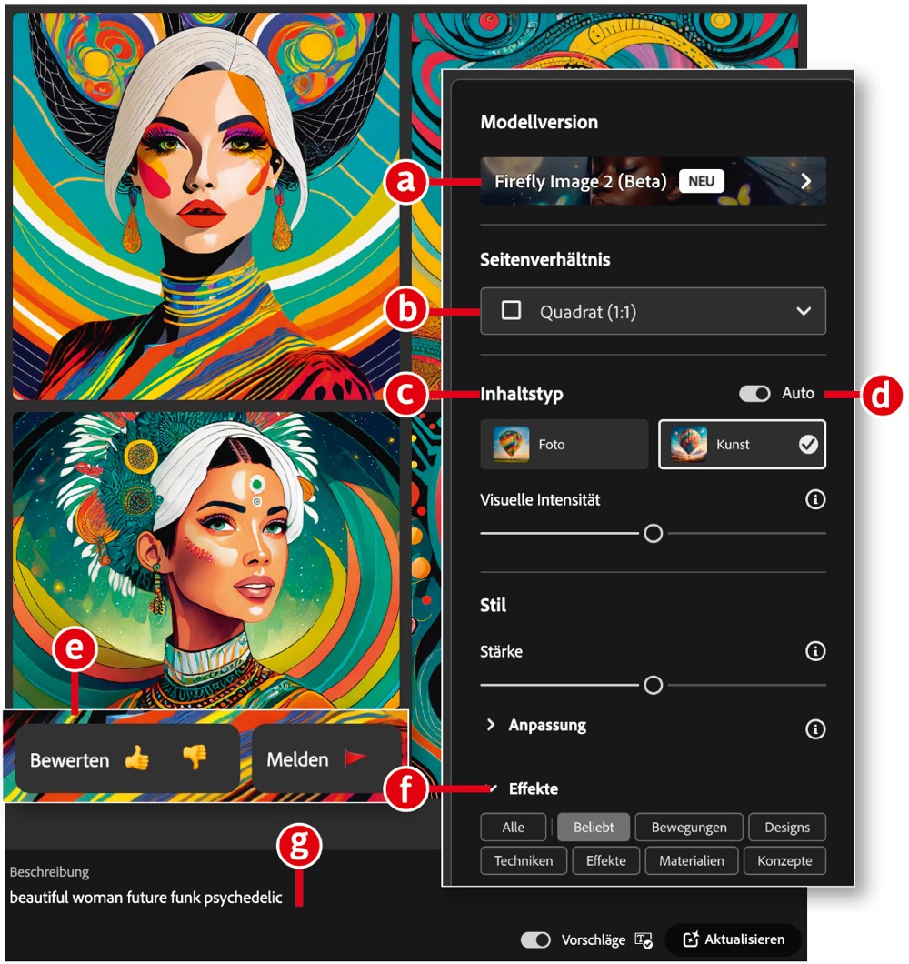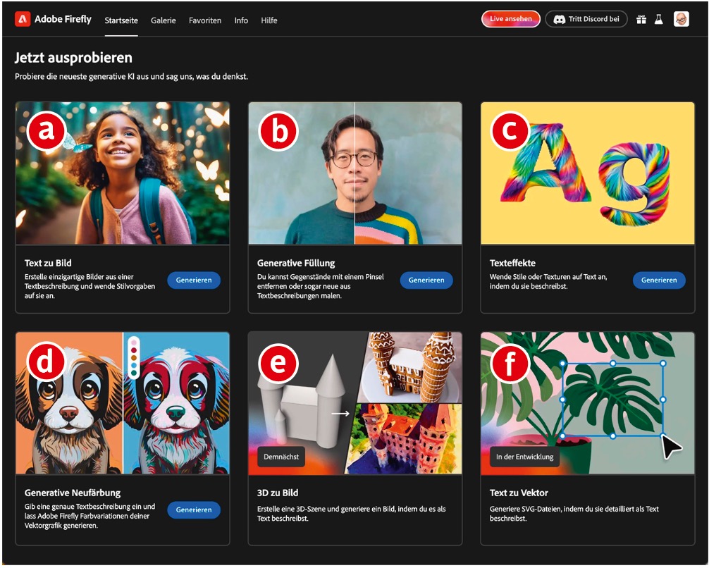 Adobe Firefly finden Sie auf https://firefly.adobe.com. Hierbei handelt es sich nicht um eine einzelne KI, sondern um eine Sammlung verschiedener KI-Modelle, von denen die „Text zu Bild“-Generierung (a) nur eine ist. Aktuell gibt es drei weitere: Die »Generative Füllung« (b) entspricht der von Photoshop. »Texteffekte« (c) ermöglicht das Erzeugen von illustrativ stilisierten Zeichen und Wörtern. Die »Generative Neufärbung« (d) erlaubt das Umfärben von Vektorgrafiken und ist eine Funktion, die sich auch in Adobe Illustrator findet. Weitere Modelle werden nach und nach hinzugefügt, von denen manche bereits auf der Seite angekündigt sind, wie beispielsweise »3D zu Bild« (e) oder »Text zu Vektor« (f).