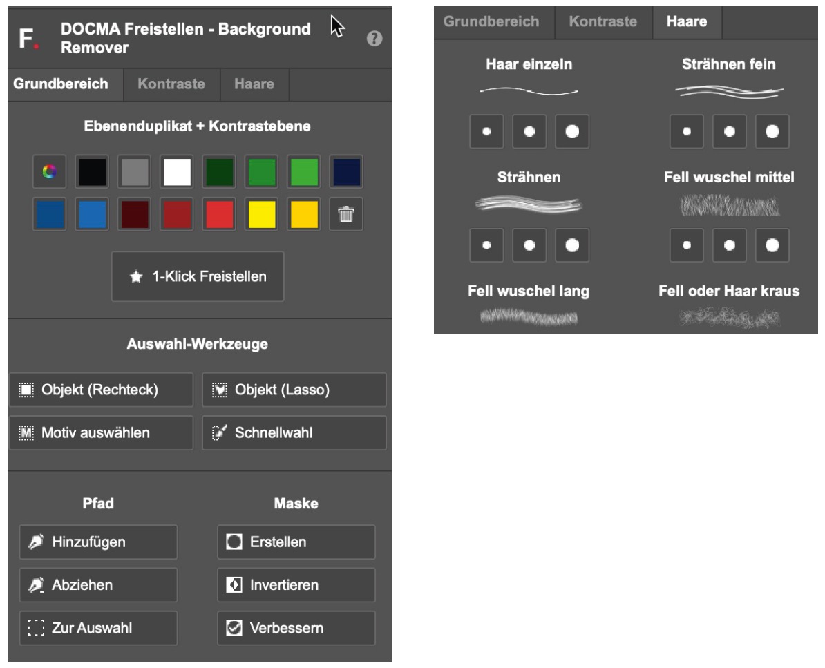 Unsere in Zusammenarbeit mit Picture Instruments entwickelte Photoshop-Erweiterung »DOCMA Freistellen« beschleunigt den Zugriff auf Photoshops Freistell-Werkzeuge und führt durch den Maskierungsprozess. Mit nur einem Klick wird ein Motiv erkannt und maskiert. Hilfsebenen erzeugen und variieren Sie per Mausklick. Automatisch an die jeweilige Bildgröße angepasste Werkzeug-Vorgaben erleichtern das Optimieren von Masken sowie das Malen von Fell und Haaren. Ich kann Ihnen nur empfehlen, sich anhand meiner umfangreichen Videoanleitungen zum Panel einen eigenen Eindruck zu verschaffen.