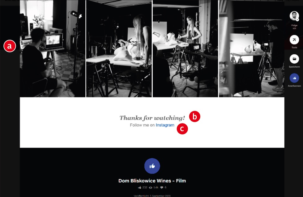 Bēhance ist ein guter Ort, um von Kreativen gefunden zu werden. Art-Direktoren, Art Buyer und andere mögliche Auftraggeber sind hier auf der Suche nach kreativen Köpfen. Schreiben Sie eine Projektbeschreibung und fügen Sie Schlüsselwörter in den Projekteinstellungen ein. Machen Sie Angaben zu Ihrer Ausrüstung, der Software und den Techniken, die Sie einsetzen. Das hilft dabei, gefunden zu werden. Zeigen Sie zusätzlich, wie Sie arbeiten. Potenzielle Kunden und Personen, die mit Ihnen zusammenarbeiten möchten, interessiert es, wie Ihre Projekte entstehen. Zeigen Sie am Ende eines Projekts oder einer Serie zum Beispiel einige Behind-the-Scene-Bilder (a), Bedanken Sie sich bei Ihrem Publikum für die Aufmerksamkeit! (b) Vergessen Sie nicht den Hinweis (c), wo es mehr von Ihnen zu sehen gibt.