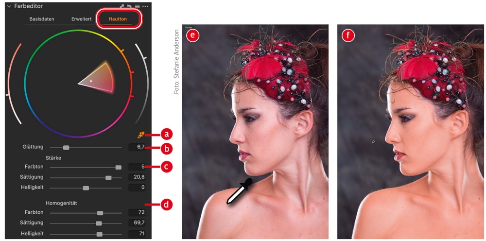 Dieses Werkzeug erlaubt es, die Hautfarben zu optimieren und zu vereinheit­lichen. Mit der Pipette (a) nehmen Sie einen Hautton im Bild auf. Die Farbtoleranz senken oder erhöhen Sie mit »Glättung« (b). Mit »Farbton« (c) lassen sich die Hauttöne kühler oder wärmer gestalten. Interessant ist vor allem der Bereich »Homogenität« (d). Mit den Reglern gleichen Sie Farbton, ­Sättigung und Helligkeit der Haut anhand des im Ausgangsfoto (e) aufgenommenen Hauttons an. Die hier sehr kräftigen Einstellungen verdeutlichen die Wirkung (f).