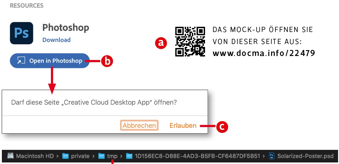 Tragen Sie den Öffnen-Link (a) in die Adresszeile Ihres Internet-Browsers ein und drücken Sie »Enter«. Auf der sich öffnenden Adobe-Seite klicken Sie auf »Open in Photoshop« (b). Die Datei wird über die Creative-Cloud-Desktop-App geladen und in Photoshop geöffnet. Erlauben Sie, dass Ihr Browser die App öffnen darf (c). Die Datei wird zunächst in einem temporären Ordner gespeichert. Rufen Sie »Datei > Speichern unter« auf und wählen Sie einen anderen Speicherort, um die Datei später wiederzufinden.
