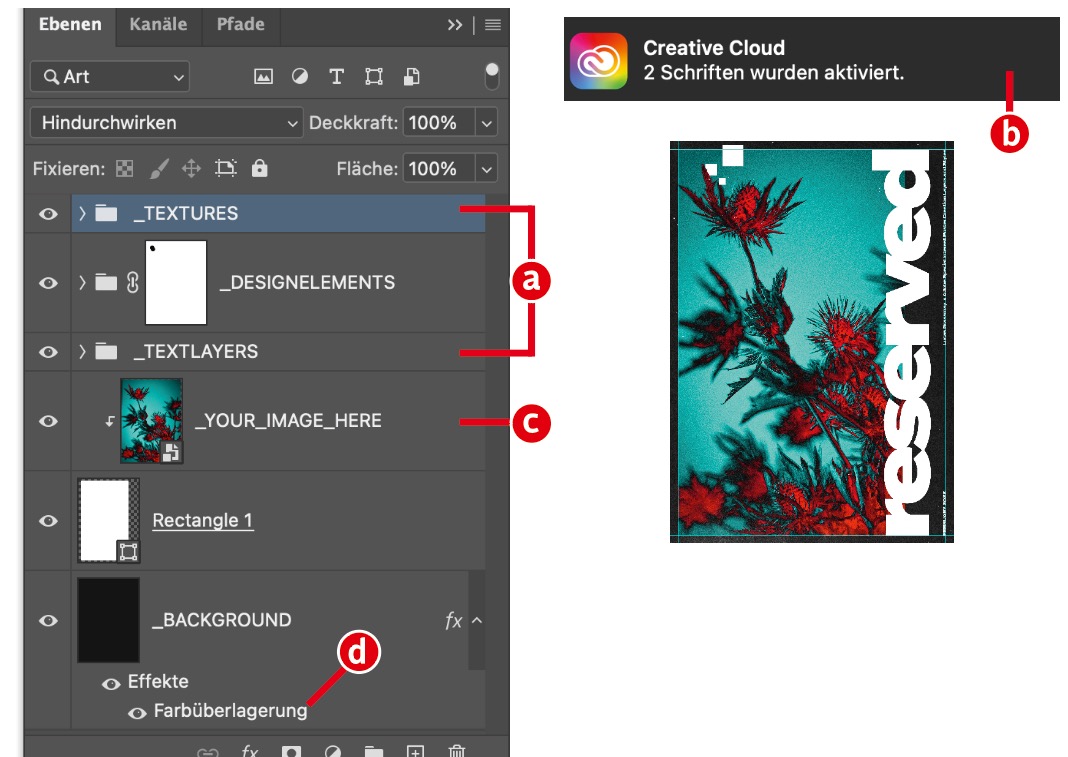 Überlagerte Elemente wie Texturen, Formen und Text-Ebenen sind sortiert in Gruppen zusammengefasst (a). Die erforderlichen Schriften werden durch die CC-App automatisch aktiviert (b). Das Smartobjekt namens „Your image here“ (c) …