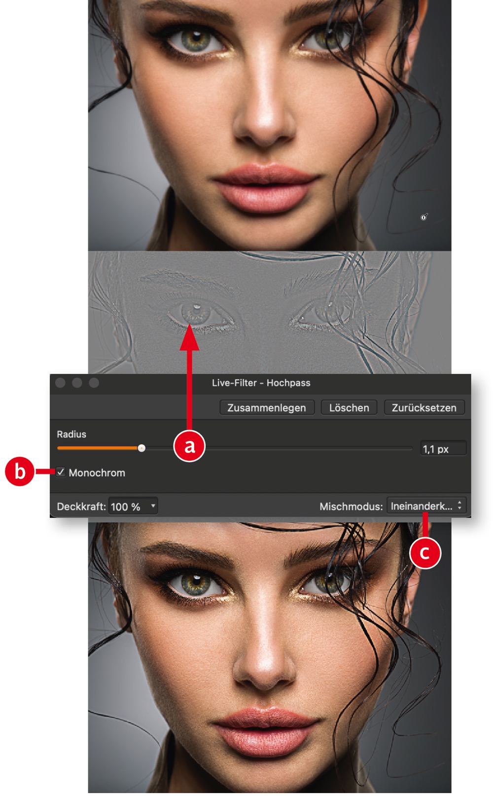 Mit dem »Hochpass«-Filter schärfen Sie Bilder auf sanfte Art. Das macht ihn vor allem für Einsteiger in die Bildbearbeitung interessant. Erzeugen Sie eine »Hochpass«-Live-Filter-Ebene. Erhöhen Sie dann den Radius (a) gerade so weit, dass Sie die Details erkennen können, die Sie schärfen wollen. Um Farbverschiebungen zu vermeiden, Aktivieren Sie die Checkbox »Monochrom« (b). Ändern Sie den Modus der Ebene in »Weiches Licht« oder für ein kräftigeres Schärfungsergebnis in »Ineinanderkopieren«. Das geht übrigens auch direkt im Filterdialog (c).