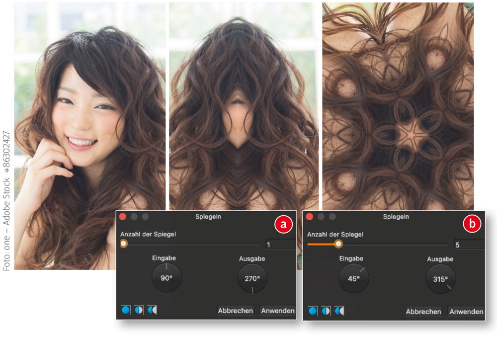 »Filter > Verzerren > Spiegeln« lädt zum kreativen Spielen ein. Mit nur einer Spiegelachse erzeugen Sie eine vertikale Spiegelung innerhalb eines Bildes, wenn der »Eingabe«-Winkel auf 90° und der »Ausgabe«-Winkel auf 270° steht (a). Eine horizontale Spiegelachse erhalten Sie mit einem Winkel von 0° für beide Parameter. Die Mitte der Spiegelachsen verschieben Sie durch Klicken und Ziehen im Bild. Spannend wird es, wenn Sie die Anzahl der »Spiegel« (bis auf maximal 20) erhöhen (b). Sie erhalten unzählige kaleidoskopische Bildvariationen, indem Sie den Spiegelmittelpunkt, die »Spiegel«-Zahl und »Eingabe«/»Ausgabe« variieren.