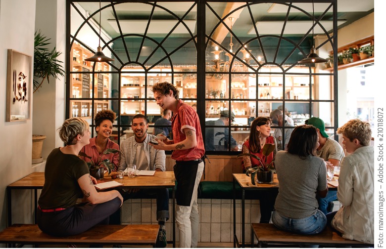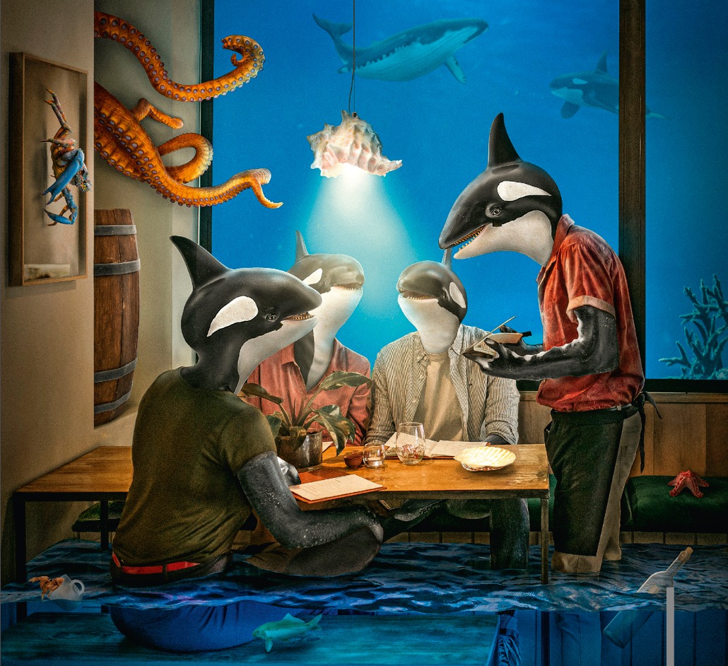 Die Bühne für mein Composing sollte ein Lokal mit einigen Besuchern sein, die ich in Wale umwandeln kann. Mit diesen Eckdaten bin ich bei der Recherche in Adobe Stock auf das nebenstehende Motiv gestoßen, das nicht nur meine Anforderungen erfüllt, sondern mich auch zu einem Ausbau meiner ursprünglichen Idee inspiriert hat – denn der Bildhintergrund ist ideal, um Fenster zu simulieren, die den Eindruck vermitteln, das Lokal läge unter Wasser.