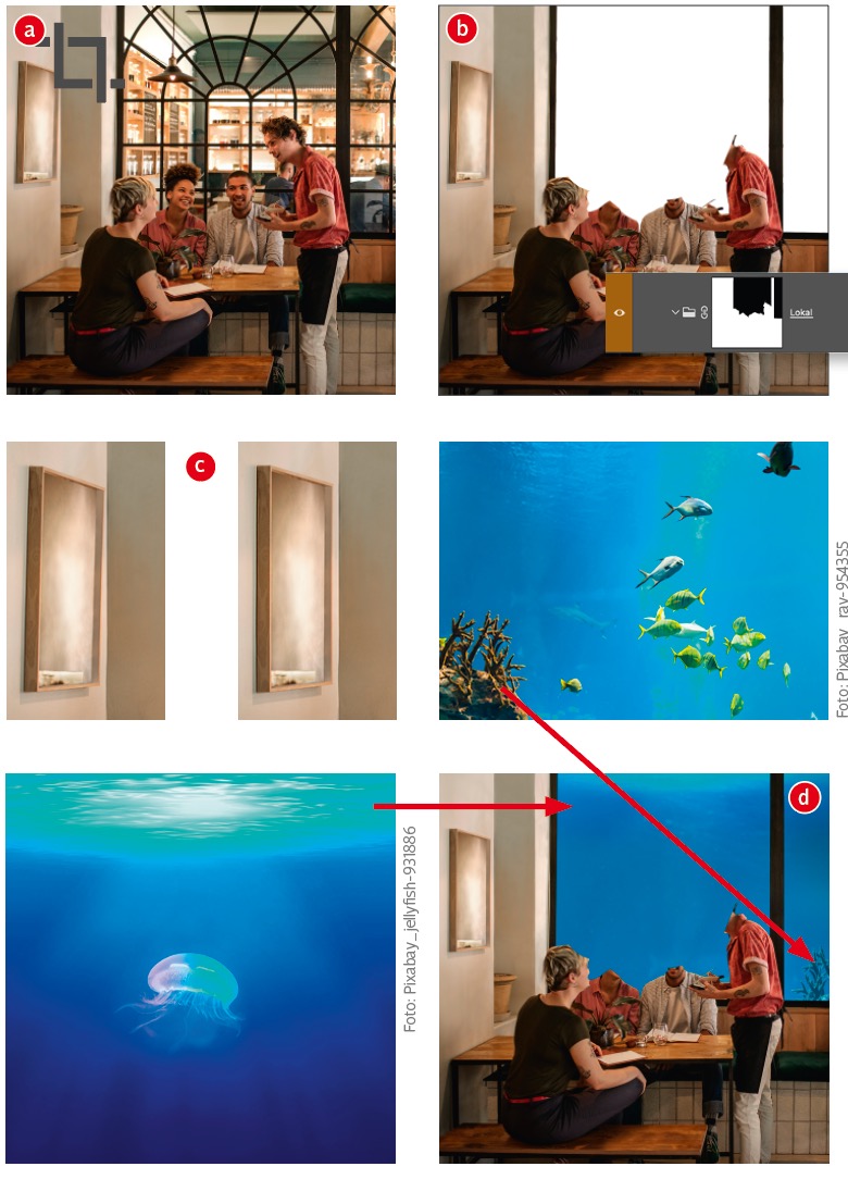 Ich mag das quadratische Format und habe mit dem »Freistellen«-Werkzeug das Bild passend zugeschnitten (a). Die Bereiche, die die Fenster zum Meer werden sollten, blendete ich per Ebenenmaske aus. …