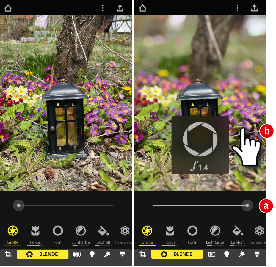 Die grundlegende Funktionsweise der App ist einfach. Sie analysiert ein Foto beim Öffnen und erzeugt eine Tiefenkarte, falls noch keine vorhanden ist. Deren Qualität ist stark motivabhängig – bei Bedarf können Sie später noch manuell korrigierend eingreifen. Über den »Blende«-Schieberegler (a) legen Sie die Stärke der Weichzeichnung fest (wie bei einer Kamera entsprechen kleine Blendenwerte einer geringen Schärfentiefe). Durch Tippen im Bild wählen Sie sozusagen den Autofokuspunkt, also die Bildstelle, die scharf bleiben soll (b).
