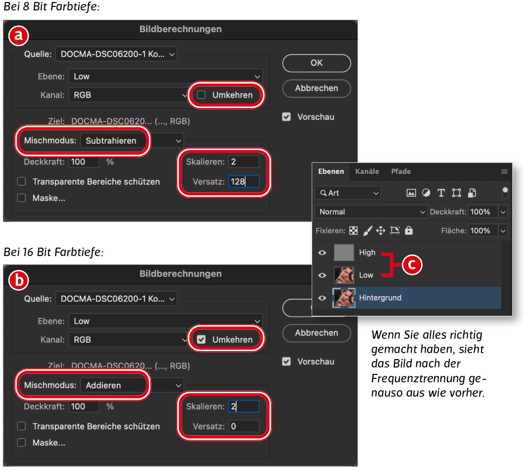 - Aktivieren Sie die „High“-Ebene und rufen Sie den Dialog »Bild > Bildberechnungen« mit den gezeigten Einstellungen entsprechend der Farbtiefe des Bildes von 8 (a) oder 16 (b) Bit/Kanal auf. Ändern Sie die Füllmethode der High-Ebene auf »Lineares Licht«.