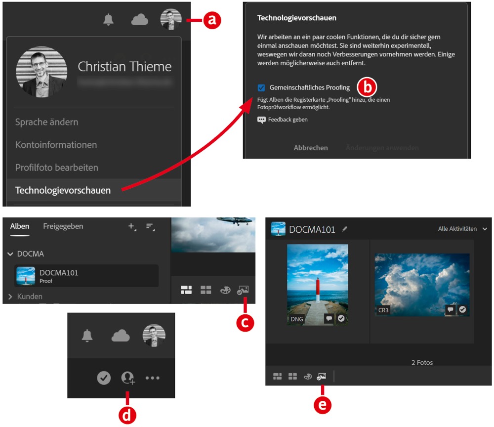 Die Beta-Funktion »Gemeinschaftliches Proofing« vereinfacht den Freigabe-Workflow mit anderen Nutzern deutlich. Klicken Sie unter dem Menüpunkt »Hilfe« auf »Lightroom Web«. Sie werden im Browser auf die Cloud-Version von Lightroom weitergeleitet. Über Ihr Profilbild (a) wählen Sie die Funktion »Technologievorschauen«. Aktivieren Sie dort »Gemeinschaftliches Proofing« (b) und verlassen Sie den Dialog über »Änderungen anwenden«. Markieren Sie ein gewünschtes Album und aktivieren Sie »Proofing« (c). Einen Freigabelink erzeugt Lightroom in den »Proofing-Einstellungen« (d). Dem Empfänger wird das Album im Browser angezeigt. Ist dieser mit seinem Nutzerkonto angemeldet, besteht die Möglichkeit, Kommentare zu hinterlassen und das Bild freizugeben. Lightroom für Web listet diese Informationen in der »Proofing-Ansicht« (e) auf. Klicken Sie auf ein Bild, um die hinterlegten Bemerkungen aufzurufen.