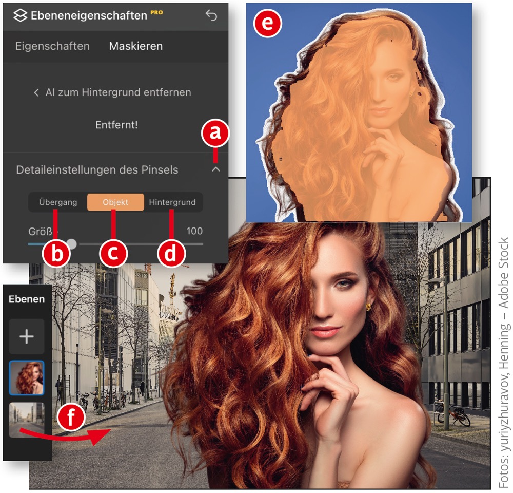 Beim Kombinieren von Fotos ist das Entfernen des Hintergrunds eine essenzielle Funktion, die Skylum per Erweiterung zur Verfügung stellt. Diese finden Sie unter »Ebeneneigenschaften > Maskieren > AI zum Hintergrund entfernen«, um in Luminar Neo gezielt einzelne Bildbestandteile zu optimieren oder einfache Fotomontagen anzulegen. Die Ergebnisse können sich bei einem klar erkennbaren Hintergrund sehen, aber oft auch länger als nötig auf sich warten lassen. Die Maske können Sie weiter verfeinern, indem Sie auf »Detaileinstellungen des Pinsels« (a) klicken und dann die „Trimap“ (e) aus den Bereichen Übergang (b), Objekt (c) und Hintergrund (d) durch Malen im Bild optimieren. Für aufwendigere Fotomontagen fehlen Luminar Neo noch die Mittel – etwa, um den eingefügten Hintergrund (f) angepasst weichzuzeichnen.