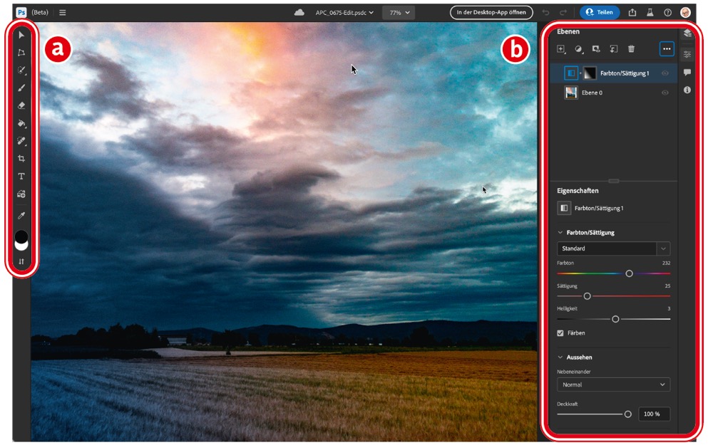 Dabei müssen Sie bedenken, dass auch die iPad-Version zwei Jahre nach ihrer Veröffentlichung immer noch den Großteil der Desktop-Version vermissen lässt. Dadurch sind die kreativen oder gar professionellen Einsatzmöglichkeiten sehr eingeschränkt. Um so mehr trifft das auf Photoshop im Browser zu. Hier geht es aktuell noch in erster Linie um die Möglichkeiten bei der Teamarbeit, also beim Einholen von Feedback und einem Review der Bildergebnisse. Von Vorteil ist dabei, dass Photoshop on the Web – genau wie die iPad-Version – alle Photoshop-Dateien korrekt darstellen kann, auch wenn nicht alle Funktionen benutzbar sind. Die wichtigsten Werkzeuge zum Malen, Retuschieren, Maskieren und Hinzufügen von Text sind vorhanden (a). Sowohl das Ein- und Ausblenden …