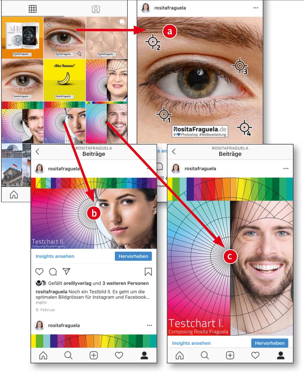 In den Profil-Feeds sehen Sie in der Rasteransicht kleine quadratische Voransichten der Beitragsbilder. Sie müssen aber nicht nur quadratische Bilder (a) posten. Sie können ebenso horizontale (b) und hochformatige (c) Bilder verwenden. Sie werden komplett angezeigt, sobald Sie auf eine Vorschau tippen. Bilder im Hochformat (c) sind besonders empfehlenswert, da sie mehr Platz auf dem Smartphone-Bildschirm einnehmen und dadurch präsenter wirken.
