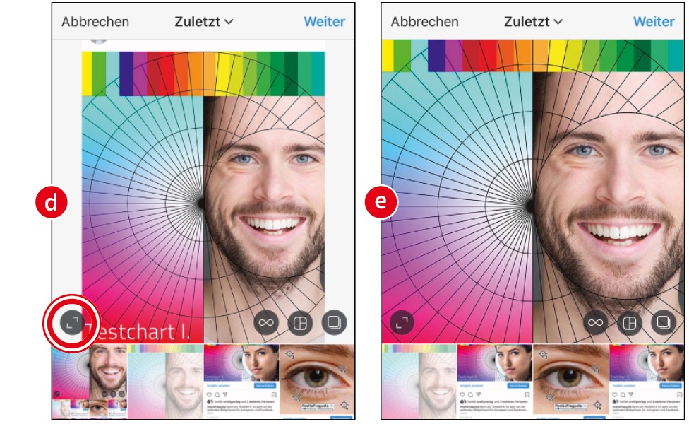 Sie links unten auf das kleine Icon mit den zwei Ecken, damit das Bild als Ganzes übernommen wird (d). Sonst beschneidet Instagram das Bild, und anschließend …