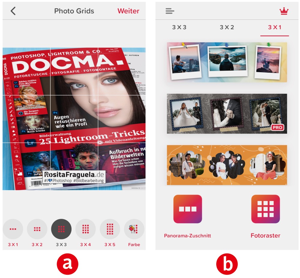Spezialisiert auf Instagram-Puzzles: Die App „Grid Post“ (Android & iOS) lässt sich bereits mit der kostenlosen Version gut nutzen. Es gibt mehrere Raster (a) und Layouts (b). Damit posten Sie die Puzzleteile direkt oder speichern sie für später auf Ihrem Smartphone beziehungsweise Tablet.