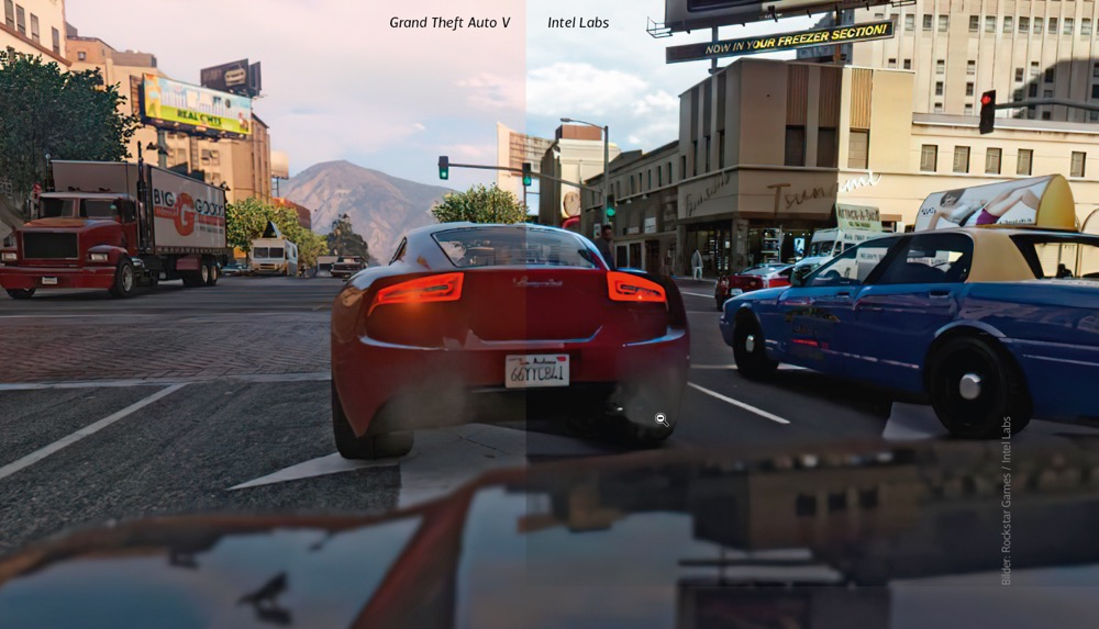 Um die Bilder von Computerspielen noch wirklichkeitsgetreuer zu machen, könnte man das physikalische Modell der simulierten Welt perfektionieren, aber der Rechenaufwand für das Rendering wäre dann immens. Statt den Weg des Lichts von der Lichtquelle bis zum Auge des virtuellen Betrachters noch präziser zu modellieren, haben Stephan Richter, Hassan Abu AlHaija und Vladlen Koltun von den Münchner Intel Labs neuronale Netze anhand von Realbildern darauf trainiert, dem Output eines Videospiels eine fotorealistische Anmutung zu verleihen.