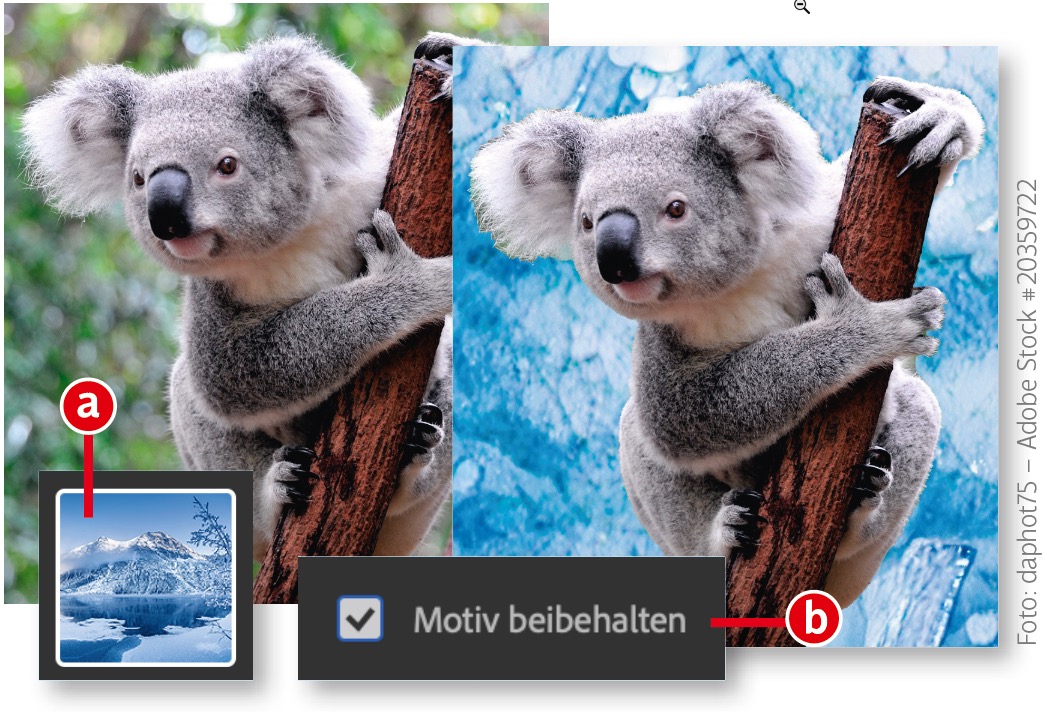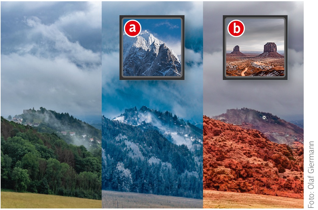Den »Landschaftsmischer« finden Sie unter »Filter > Neural Filters > Beta«. Zum Zeitpunkt des Redaktionsschlusses war der Filter als Beta-Version also noch in der aktiven Entwicklung. Dadurch, aber auch, weil sich die Filter-Ausgabe durch das maschinelle Lernen mit jedem Update ändert, sollten Sie stets mit einer gewissen Zufälligkeit der Ergebnisse rechnen. Anders als etwa bei mathematisch einfach funktionierenden Filtern, wie zum Beispiel »Unscharf maskieren«, hat eine identische Kombination der Parameter nicht in allen kommenden Filter-Versionen dasselbe Resultat zur Folge. Das sollten Sie berücksichtigen, wenn Sie etwa das Winter- (a) oder das Wüsten-Preset (b) anwenden und abweichende Ergebnisse erhalten.
