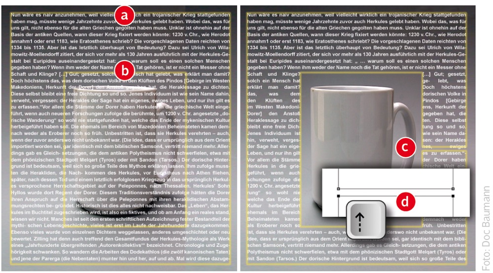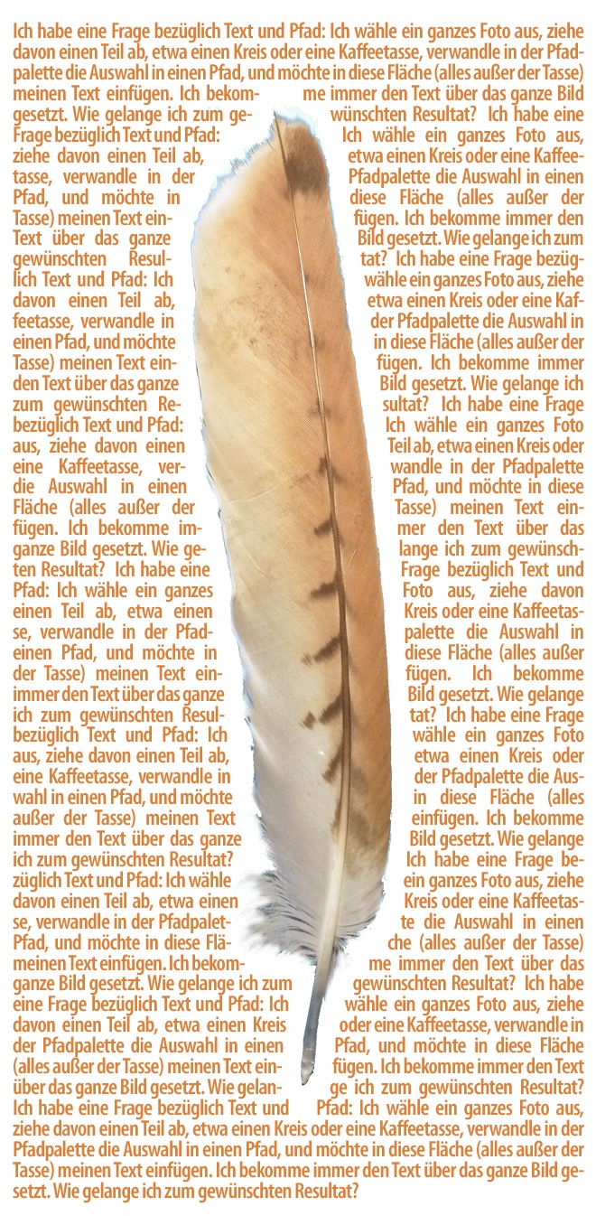 Sehr geehrter Herr Baumann, liebes DOCMA-Team, ich habe eine Frage bezüglich Text und Pfad: Ich wähle ein ganzes Foto aus, ziehe davon einen Teil ab, etwa einen Kreis oder eine Kaffeetasse, verwandle in der Pfadpalette die Auswahl in einen Pfad, und möchte in diese Fläche (alles außer der Tasse) meinen Text einfügen. Ich bekomme aber immer den Text über das ganze Bild gesetzt. Wie gelange ich zum gewünschten Resultat?