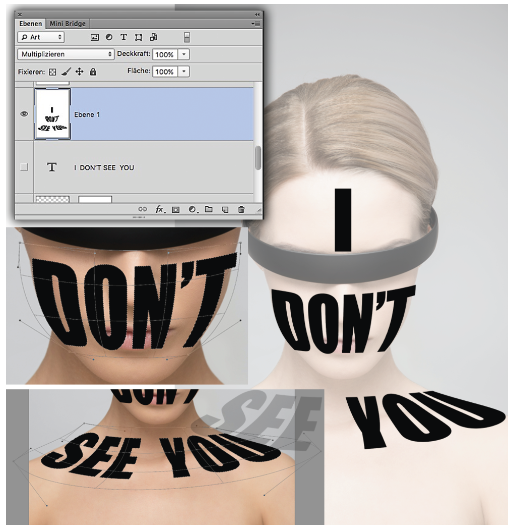 in der TV-Serie „The Following“ habe ich Montagen mit fettem Text auf Gesicht/Hals/Schultern gesehen, die ich gern nachmachen würde. Bei mir sieht das aber nicht aus wie auf eine plastische Oberfläche aufgetragen, sondern die Schrift liegt einfach nur platt über dem Körper. Kennen Sie einen Tipp, wie man das besser hinkriegt? Schon mal danke und herzliche Grüße, Christa Kuhn