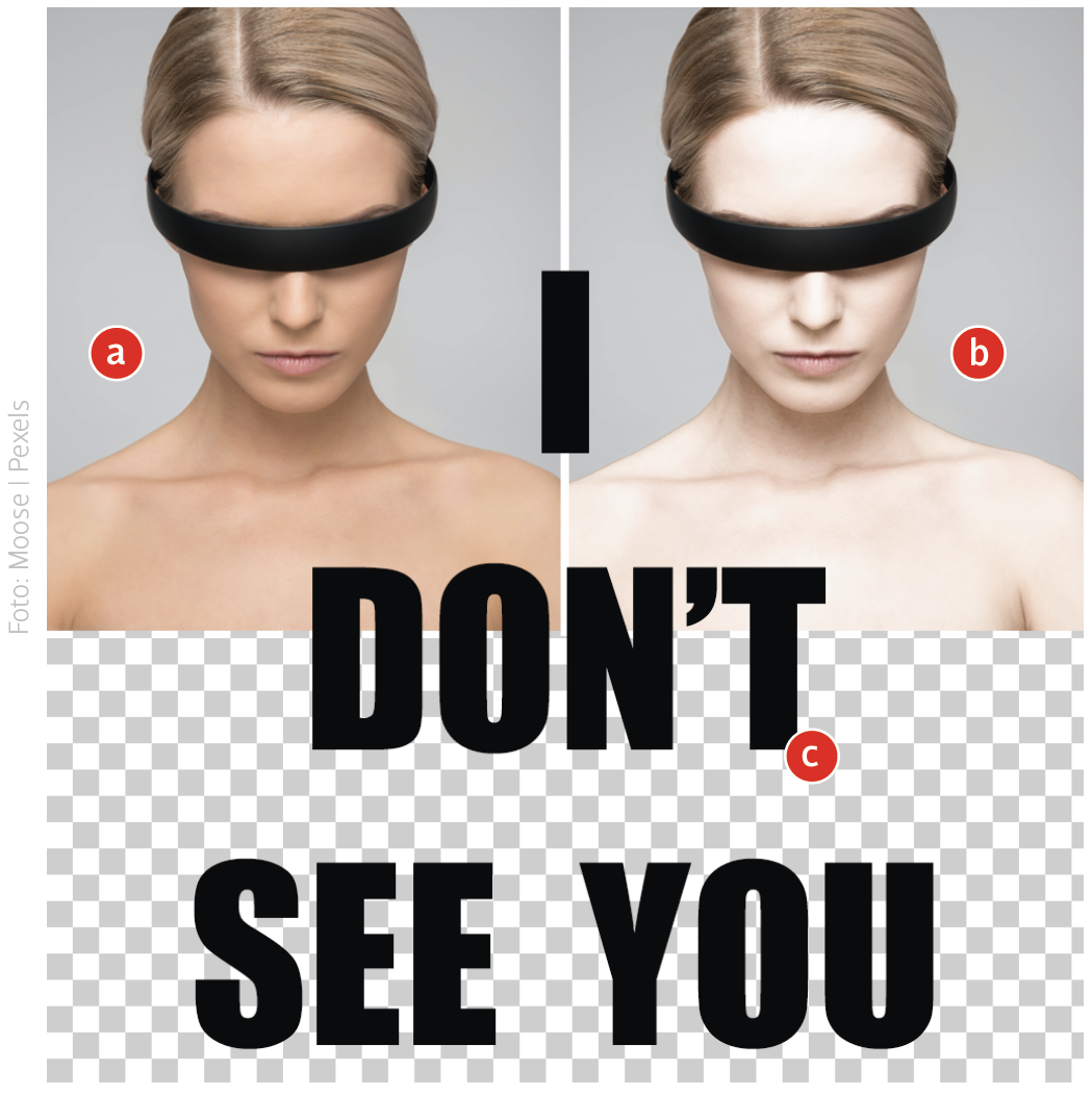 Für ein solches Projekt benötigen Sie zwei Elemente: Das Hintergrundbild mit Gesicht, Hals und Schultern sowie den scheinbar darauf gemalten Text. Ein passendes Foto habe ich bei Pexels gefunden (a) und zur besseren Angleichung an die Referenzbilder der Serie „The Following“ die Hauttöne stark aufgehellt (b). Den Text könnte man auch malen – ich habe hier eine Vorbereitung mit dem »Text«-Werkzeug und dem Font „Impact“ vorgezogen (c).