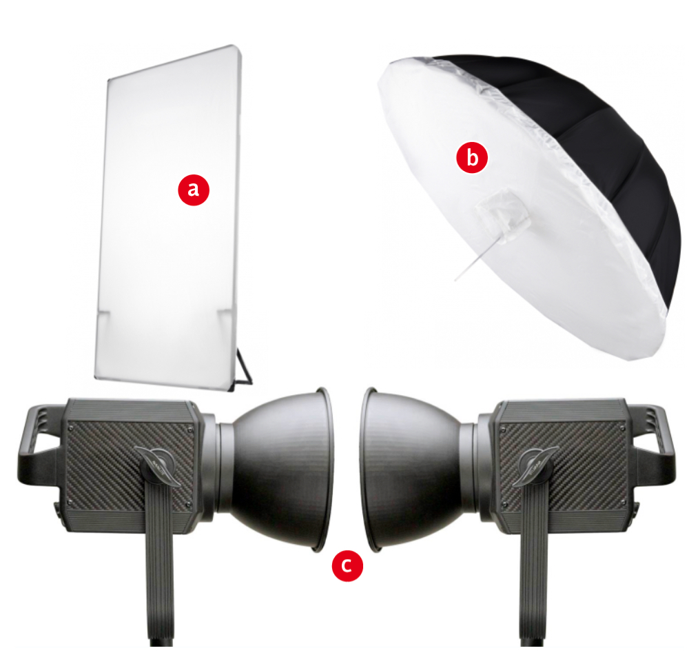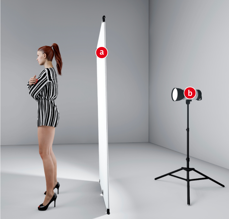 Viele Wege führen in diesem Fall nach Rom, das ist gerade in diesem Fall keine Frage. Die Aufgabenstellung lautet hier: Soviel wie möglich im Studio erledigen, so wenig wie möglich in Photoshop, und das bei minimalem Technikaufwand. Zum Einsatz kommen ein „Reflektorpanel“ (100 x 200-Zentimeter) mit Diffusor-Bespannung (a), ein großer Schirm (b) und zwei Blitzköpfe (c). Wenn Sie statt mit Studioblitzen lieber mit Dauerlicht oder Systemblitzen arbeiten, ändert das am grundsätzlichen Setup nichts.