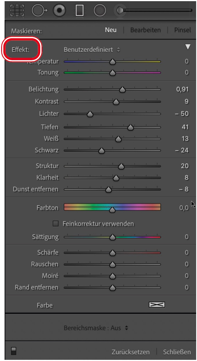 Die selektiven Werkzeuge von Lightroom merken sich die zuletzt genutzten Einstellungen. Falls Sie diese nicht verwenden wollen, müssen Sie nicht jeden Regler einzeln zurücksetzen. Adobe hat sich – anders als in Camera Raw – für eine effektive, aber wenig intuitive Lösung entschieden: Klicken Sie entweder mit gehaltener Alt-Taste oder mit einem Doppelklick auf »Effekt«, um alle Regler auf einmal zurückzusetzen.