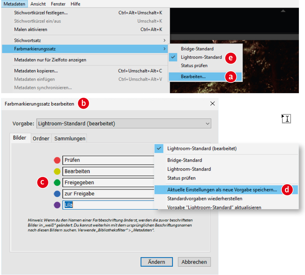 Farbmarkierungen, mit denen Sie Bilder, Ordner und Sammlungen kennzeichnen möchten, können Sie nach Belieben umbenennen. Klicken Sie im »Bibliothek«-Modul auf »Metadaten > Farbmarkierungssatz > Bearbeiten« (a). Im Fenster »Farbmarkierungssatz bearbeiten« (b) legen Sie neue Namen für die Farben (c) fest. Beachten Sie, dass beim »Ändern« die jeweilige Farbmarkierung im Katalog verschwindet. Sie können dies vermeiden, indem Sie die Änderungen als neue Vorgabe im Auswahlmenü (d) speichern. Lightroom zeigt allerdings nur die gesetzten Farbmarkierungen eines ausgewählten Markierungssatzes (e) im Katalog an.