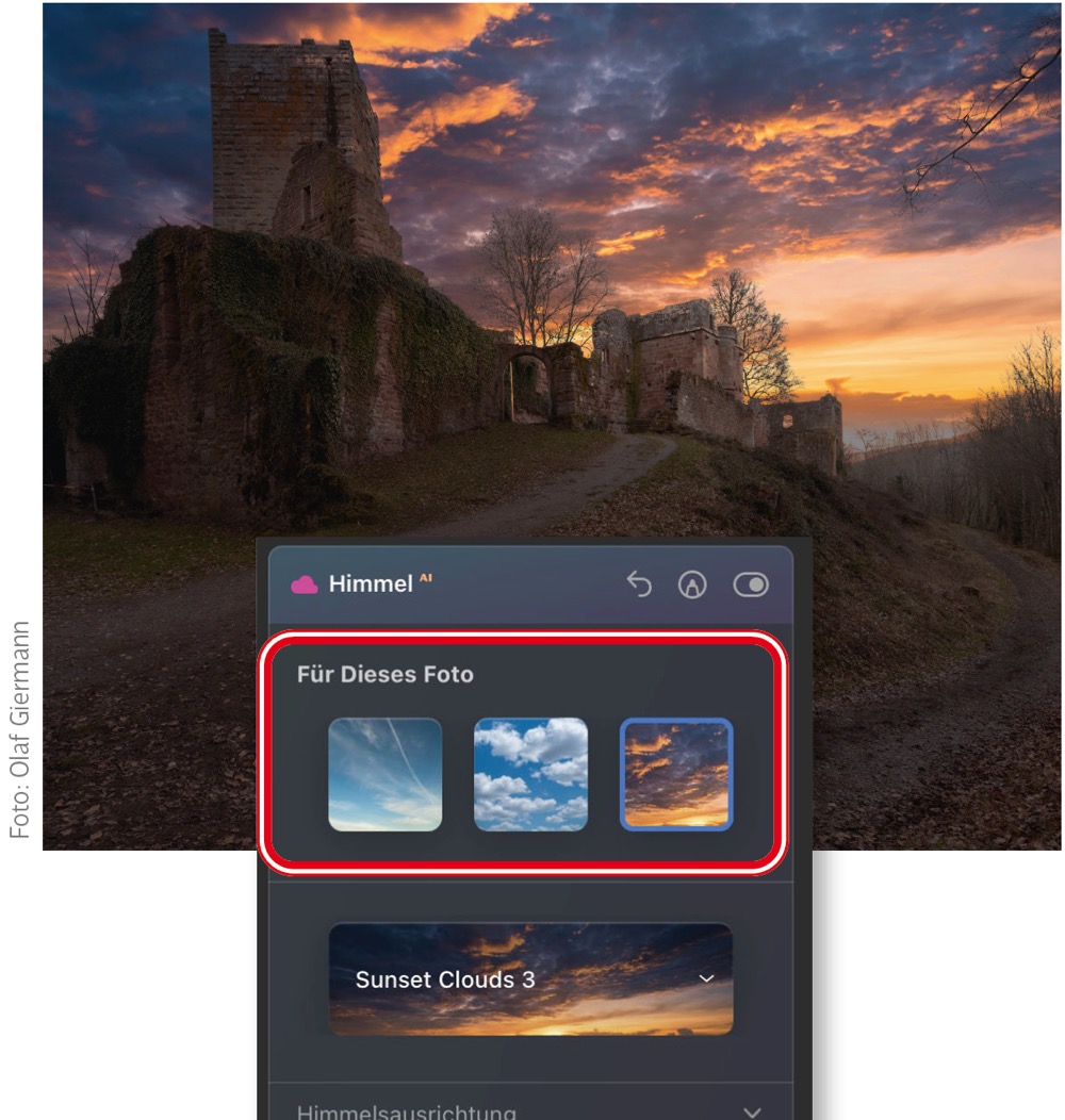 Im Panel »Himmel AI« macht Luminar AI nun drei Vorschläge für einen geeigneten neuen Himmel. Laut Skylum kommt hier eine inhaltsbasierte Technologie zum Einsatz, die das Foto analysiert und dazu passende Himmelsvorgaben empfiehlt. An welchen Kriterien sich diese Empfehlung orientiert, ist jedoch unklar: Manchmal harmonieren die Farben, manchmal stimmt sogar die Lichtrichtung – aber immer wieder einmal passt auch gar nichts. Insofern ist es wahrscheinlich nach wie vor Glückssache und Sie sollten die Vorschläge unter »Für dieses Foto« eher als reine Einladung zum Ausprobieren ansehen.