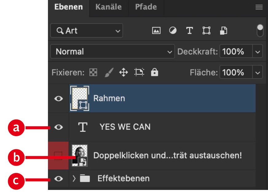 In der Textebene (a) ändern Sie bei Bedarf die Schrift und den Spruch. Das ausgeblendete Smartobjekt öffnen Sie mit einem Doppelklick auf die Ebenenminiatur (b) als neues Fenster. Fügen Sie dort ein eigenes Porträt ein, das Sie über »Auswahl > Motiv« und das Hinzufügen einer Ebenenmaske schnell und unkompliziert maskieren. Speichern Sie Ihre Änderungen und schließen Sie das Fenster. Gefällt Ihnen das Ergebnis …