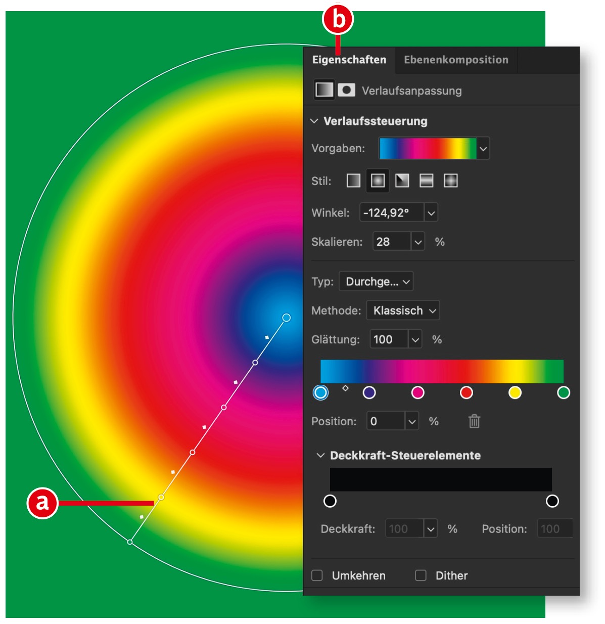 Endlich wird das Verlaufswerkzeug modernisiert und erhält ein Widget (a), mit dem man einen Verlauf live aufziehen und dessen Farbstopps direkt im Bild verändern kann. Die Verlaufsparameter sind außerdem nicht mehr in bis zu drei verschachtelten Dialogen versteckt, sondern direkt im »Eigenschaften«-Bedienfeld zugänglich (b). Ist eine Maske aktiv, funktioniert das Verlaufswerkzeug noch so wie früher (»Klassisch«). Ansonsten werden Einstellungsebenen erzeugt, bei deren Auswahl das jeweilige Widget auf der Arbeitsfläche eingeblendet wird und intuitiv bearbeitet werden kann. Für das Ändern einer Farbe doppelklicken Sie auf gesetzte Farbpunkte im Bild.