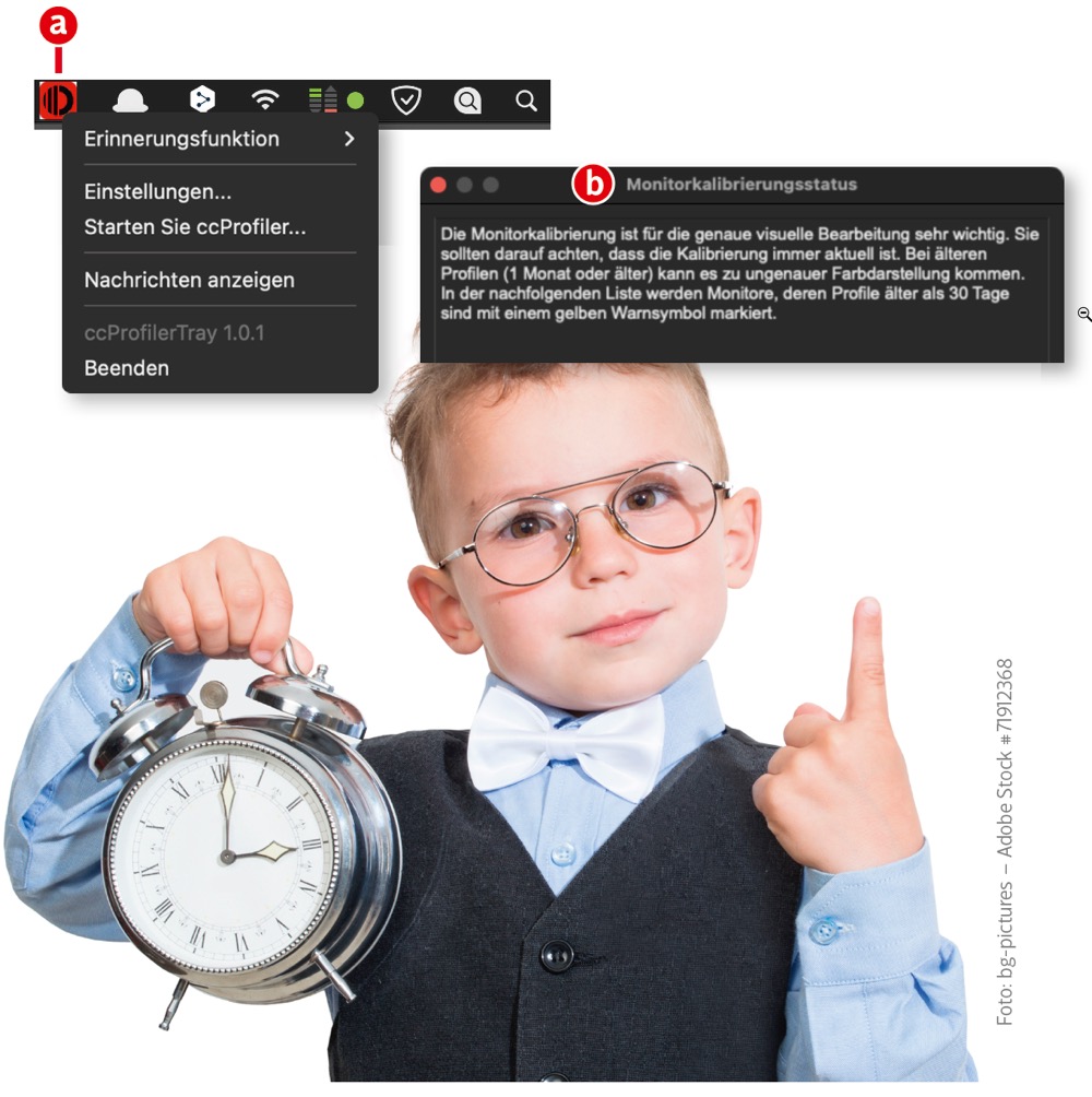 Gut, dass Kalibrierungssoftware in der Regel auch eine im Hintergrund laufende Überwachungsfunktion bietet, die einen per Farbsymbol (a) oder Signalton erinnert, wenn es wieder Zeit ist, den Monitor zu kalibrieren (b). Empfehlenswert ist bei hohen Ansprüchen mindestens eine Neukalibrierung alle 30 Tage.