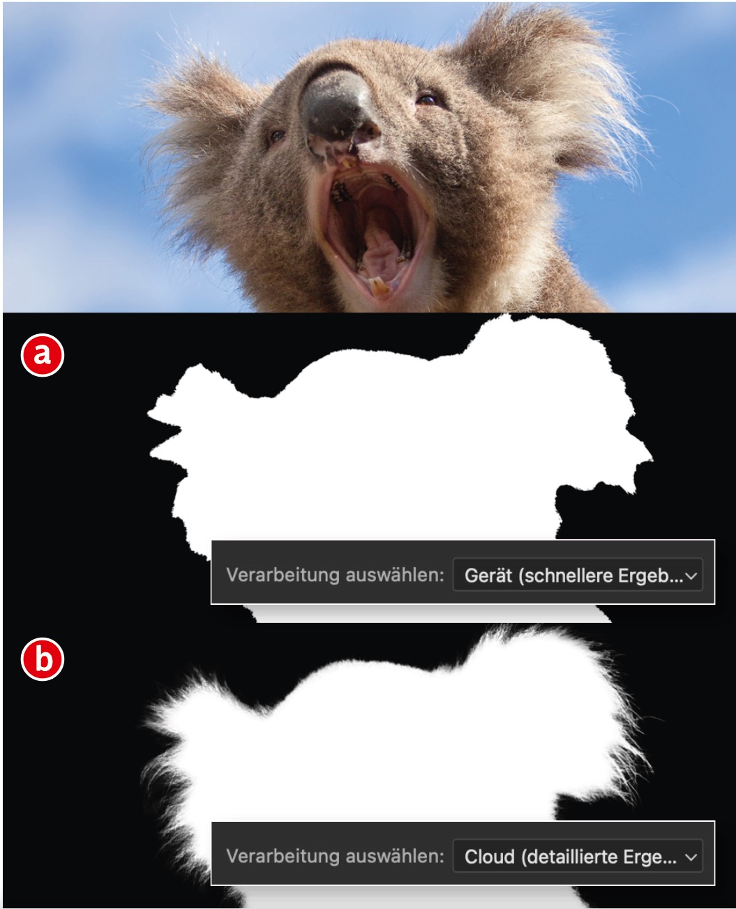 In den Voreinstellungen gibt es den neuen Bereich »Bildverarbeitung«. Hier legen Sie aktuell lediglich fest, ob »Auswahl > Motiv« auf Ihrem Computer oder in der Cloud berechnet werden soll. Die Option »Gerät« ist etwas schneller, aber vielleicht weniger genau (a). »Cloud« lädt eine Vorschau Ihres Bildes in die Creative Cloud und führt die Motiverkennung über das jeweils neueste KI-Modell auf Adobe-Servern durch. Eine schnelle Online-Verbindung ist also erforderlich. Das Ergebnis fällt abhängig vom Motiv teils ähnlich, mitunter drastisch besser aus (b).
