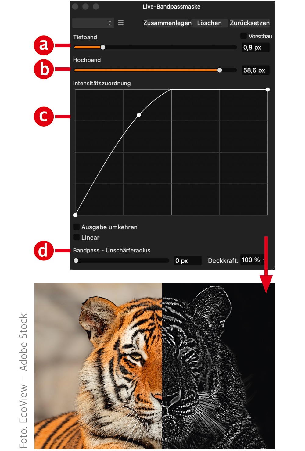 Dieser neue Maskierungsebenen-Typ ermöglicht non-destruktive Kantenmasken. Mit »Tiefband« (a) und »Hochband« (b) legen Sie fest, wie klein oder groß ein Kontrastdetail sein darf, um in der Maske als Weiß angezeigt zu werden. Mit der Kurve darunter (c) stellen Sie die Helligkeit der Kantenmaske ein und mit dem »Unschärferadius« (d) soften Sie sie. Dieser Maskentyp lässt sich prima mit Schärfungsfiltern oder zur Kantenhervorhebung auch mit Kontrast-Anpassungsebenen verwenden.