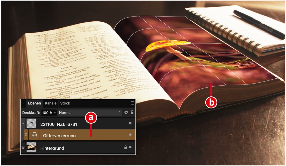 Die »Gitterverzerrung« ermöglicht den Aufbau von Mock-ups wie in Photoshop. Einer der Nachteile gegenüber Photoshop war bisher, dass es nur eine destruktive Gitterverzerrung mit dem gleichnamigen Werkzeug gab. Affinity Photo 2 hat jetzt einen entsprechenden Live-Filter (a). Selbst recht komplexe Verformungen für das Anpassen eines Fotos an geschwungene Oberflächen wie etwa Buchseiten (b) lassen sich damit nun in Affinity Photo einfach umsetzen und jederzeit nachjustieren.